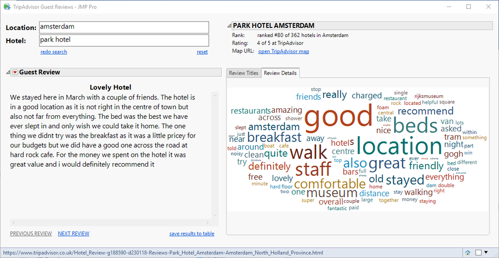 @David_Burnham wrote:This add-in uses pattern matching to "web scrape" TripAdvisor hotel reviews. Guest comments can be reviewed in a JMP report window or saved to a table (e..g. for further exploration using Text Explorer).