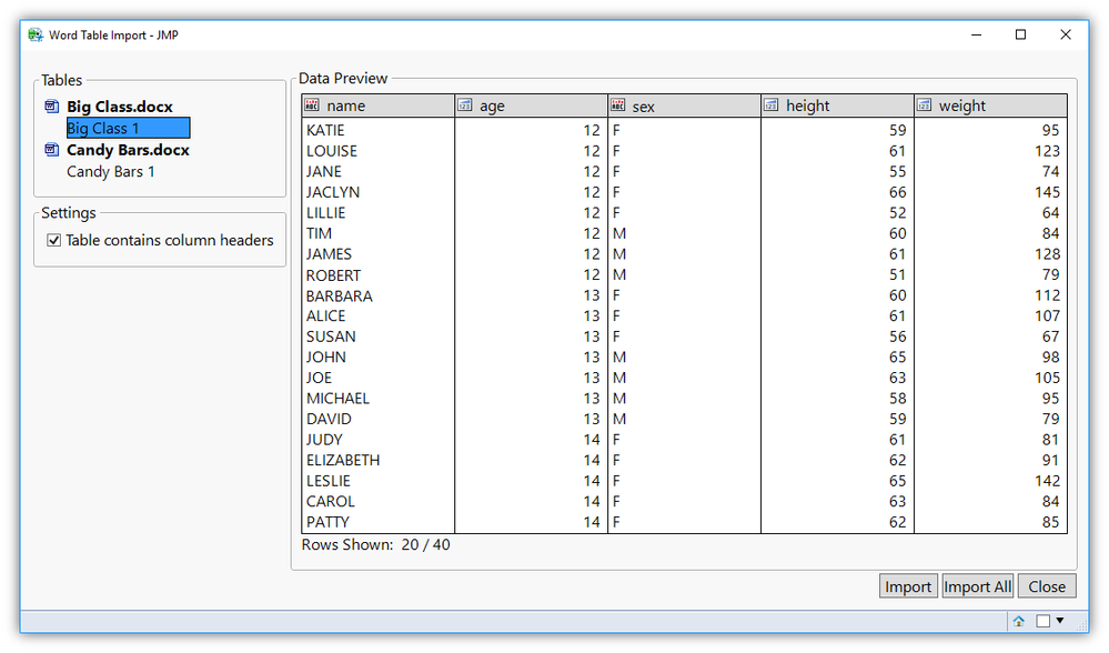 Import individual tables from a Word Document as a JMP Data Table. This feature includes a preview mode for each table with the opportunity to change column headers and data types before importing.