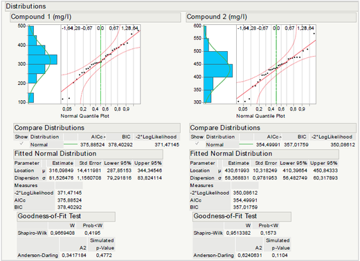 團隊在分析資料前,意識到許多品質工具假設資料來源於常態分佈。如果不符合此假設,則基於平均值和標準差的結果將不具意義。因此團隊透過分佈分析確認化合物1和化合物2資料均符合常態分佈。