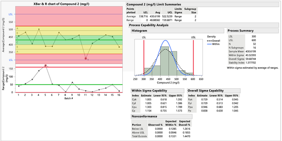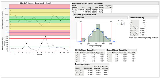 - 化合物 2 的控制圖:XBar 圖顯示批次 11 落在紅色區域,表明流程不受控且不穩定。R 圖顯示批次 5 超出管制界限,表明存在一些特殊原因變異。Cpk 值為 1.005,Cp 值為 1.154,表明化合物 2 不穩定且無法滿足規格。