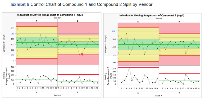 在發現兩種化合物存在特殊工序變異後,團隊將下一步集中在從供應商角度探索這些變異。將每個供應商的控制圖並排展示,有助於透過圖形直觀地理解變異來源。