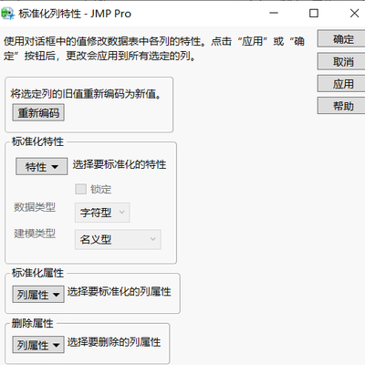 利用JMP可以對批量變量進行分類管理。由於收集的變量是定性變量,在JMP Pro 對所有變量進行標準化列特徵操作,將所有變量統一轉化為字符型名字變量。