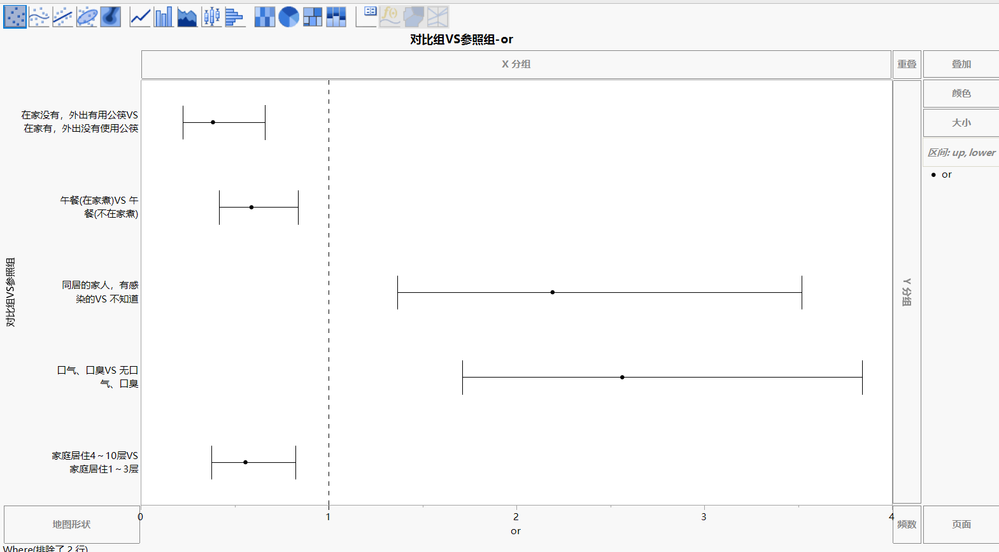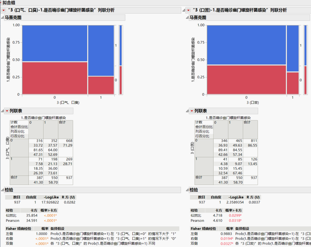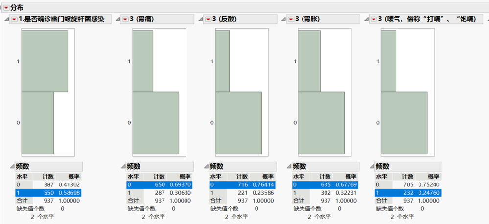 通過列聯分析和 Distribution平台可以發現,人群的居住樓層、胃痛、反酸、胃脹、沒有食欲、口氣口臭、口苦、胃鳴、饑餓感、貧血、午餐在家煮食、吸煙、外出使用公筷、使用公筷的習慣、家人朋友是否有感染有顯著性外,其他變量都沒有統計學意義。