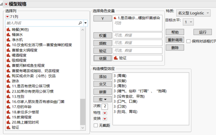 在JMP中依次點擊「分析」菜單→「擬合模型(Fit Model)」(圖2),在彈出的對話框中將是否感染幽門桿菌導入「Y」,將擬進行多因素分析的自變量導入「構造模型效應」框中。以生成驗證列為依據,進行驗證。