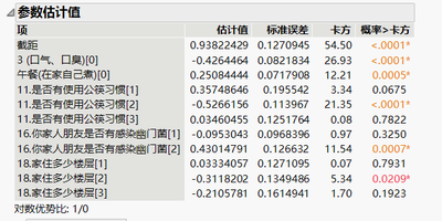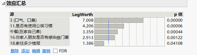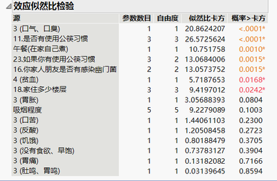 從下圖所示的效應似然比檢驗如下圖中,可以看到,口氣、口臭、是否使用公筷、午餐在家煮、使用公筷的習慣貧血、家住多少樓概率>卡方,具有統計學意義。