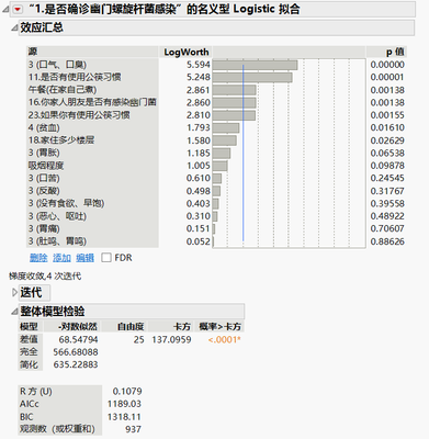 從下圖可以看出,15個自變量中貢獻最大的是口氣、口臭和使用公筷習慣,而噁心、胃痛的影響較小。該結果可以直觀反映出自變量的貢獻大小,也可以作為後續進一步進行變量篩選的參考依據。從整體模型檢驗中,概率>卡方的值小於0.001,證明構建模型有統計學意義。這裡對貢獻值偏低的變量進行刪減。