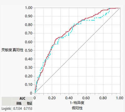 訓練組和驗證組 ROC 曲線下面積分別為 0.7334 ( 95% CI 0.709 ~ 0.784)、0.7153( 95% CI 0.6729 ~ 0.7577)。經分析,該模型處於良好水平。