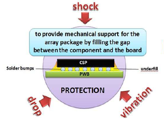點膠製程,晶片與基板熱膨脹係數不同,溫度變化造成熱應力集中於兩者間的凸塊造成破裂形成斷路 (如圖1),當基板受外力產生變形時或環境氧化也會造成凸塊變脆變質,所以就必須點膠增加晶片與基板間的接合強度及隔絕空氣並使應力重新分布(圖2),當然點膠製程的因子很多,這次只單純評估機台點膠後的重量一致性以及x和y方向的偏移程度。
