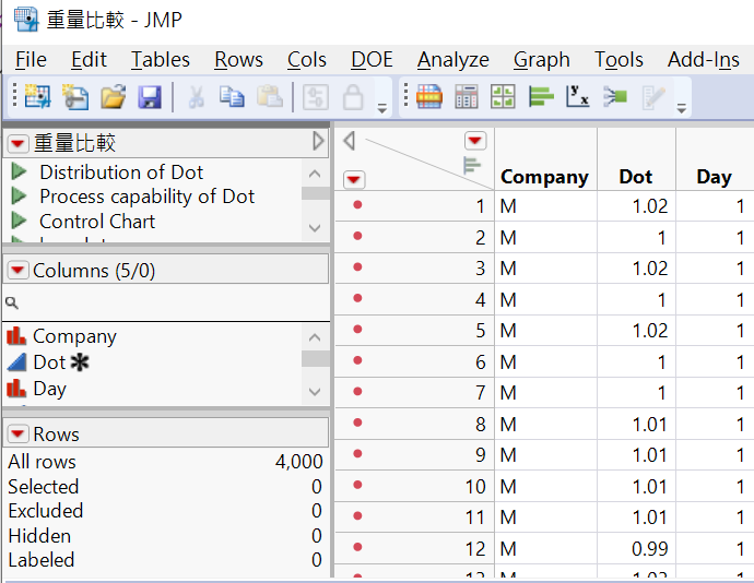 分析時,我們先從點膠重量著手 ,資料收集有公司(M,W)以及天數資料(下圖4),一開始建議先從敘述性統計下手,先了解其分布,並且將規格輸入,以便比較。
