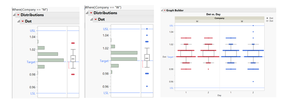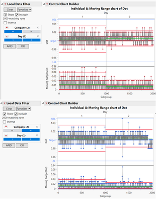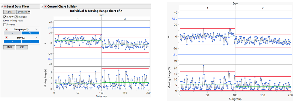 除了統計檢定外,也可以搭配管制圖的功能(圖11),搭配Local Data Filter篩選及比對資料,圖形中可以看出兩間設備商第二天的管制界線較窄,但是W公司很明顯有接近規格的點出現,如果真的因為價格因素考量,就必須調查原因為何。