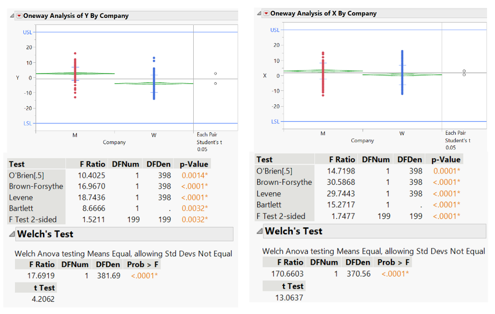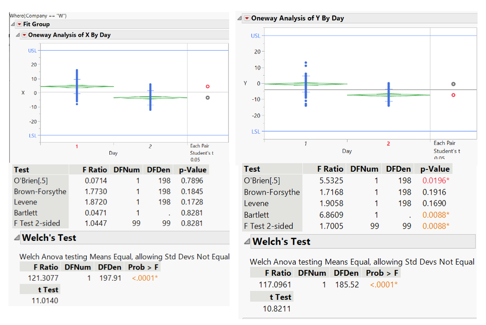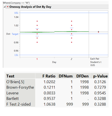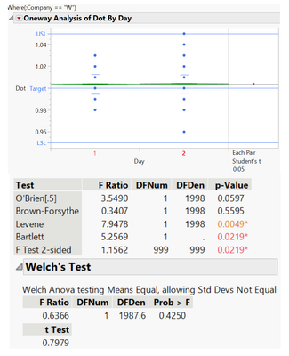 接下來就是針對天數的部份去了解不同天是否會造成兩間公司的重量會有顯著差異,根據收集的資料進行不同天的ANOVA分析,如下圖9、圖10,其中M公司兩天在變異部分沒有顯著差異,而均值部分有顯著差異,假設偏差不影響品質,一般公司會設定另外一個Practical difference當作水準,視實際是否會造成品質影響。而W公司很明顯兩天的水準有顯著差異,即使均值沒顯著差異,一般來說,調整變異會比調整偏差來的更加困難,