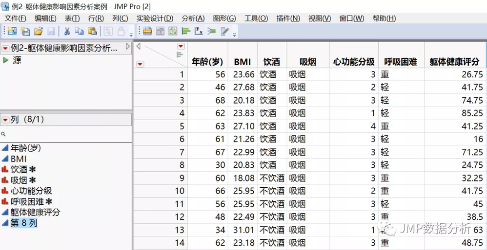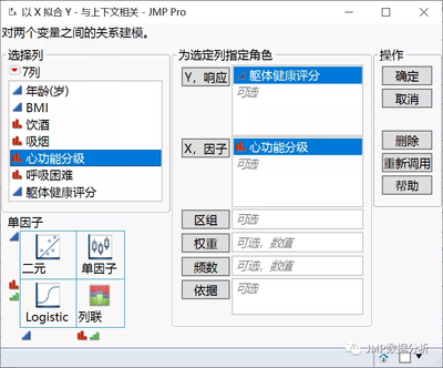 在 (圖1) 資料中,若比較不同心功能分級患者的軀體健康評分是否存在差異,心功能分級分為一到四級,因此這是一個四組之間的比較,不能直接用 t 檢定,而應考慮多組比較的方法。首先通過點選JMP菜單「分析→以X擬合Y」(如圖2),進入組間差異比較的界面。