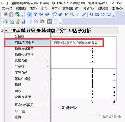如果資料滿足常態且方差齊,則可直接採用變異數分析,儘管從條件來看,本例資料應該用 Welch 檢定,但做為範例,我們同時也介紹一下變異數分析的結果如何輸出。點擊「心功能分級-軀體健康評分」單因子分析旁邊的紅色三角形按鈕,在下拉菜單中選擇「均值/變異數分析」,如圖6。