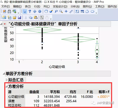 輸出結果見 (圖7),變異數分析結果表明四組的軀體健康評分差異有統計學意義 (F=16.0080,P<0.0001)。