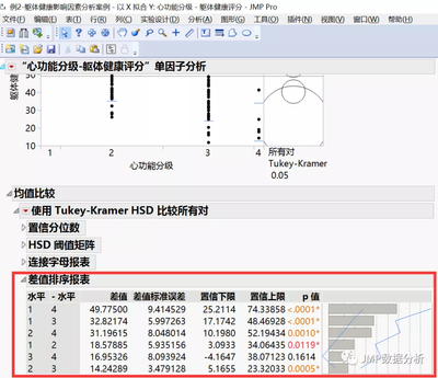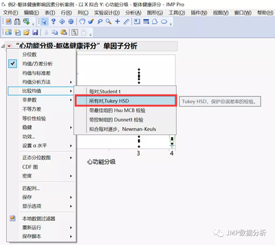 點擊「心功能分級-軀體健康評分」單因子分析旁邊的紅色三角形按鈕,在下拉菜單中選擇「比較均值→所有對,Tukey HSD」。