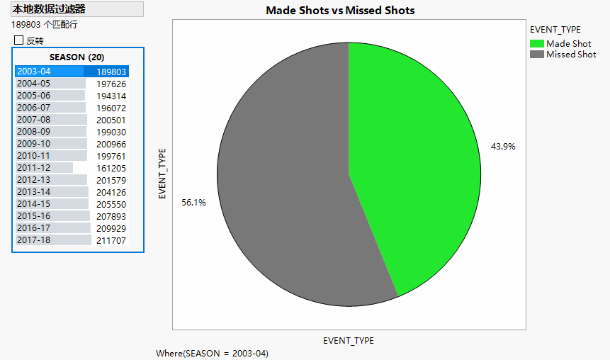 在JMP菜單欄的【圖形】中選中【圖形生成器】,左側顯示的是數據表的所有列名。用鼠標將EVENT_TYPE列(含有分類型變量Made shot和Missed shot)拖入右邊空白界面中的Y和X區域,在圖形選項中選擇【餅圖】,就可以一秒輕鬆得到超過400萬行數據蘊含的投籃命中率的資訊。配合SEASON(賽季)作為本地過濾器,就可以查看不同賽季的單獨命中率資訊。
