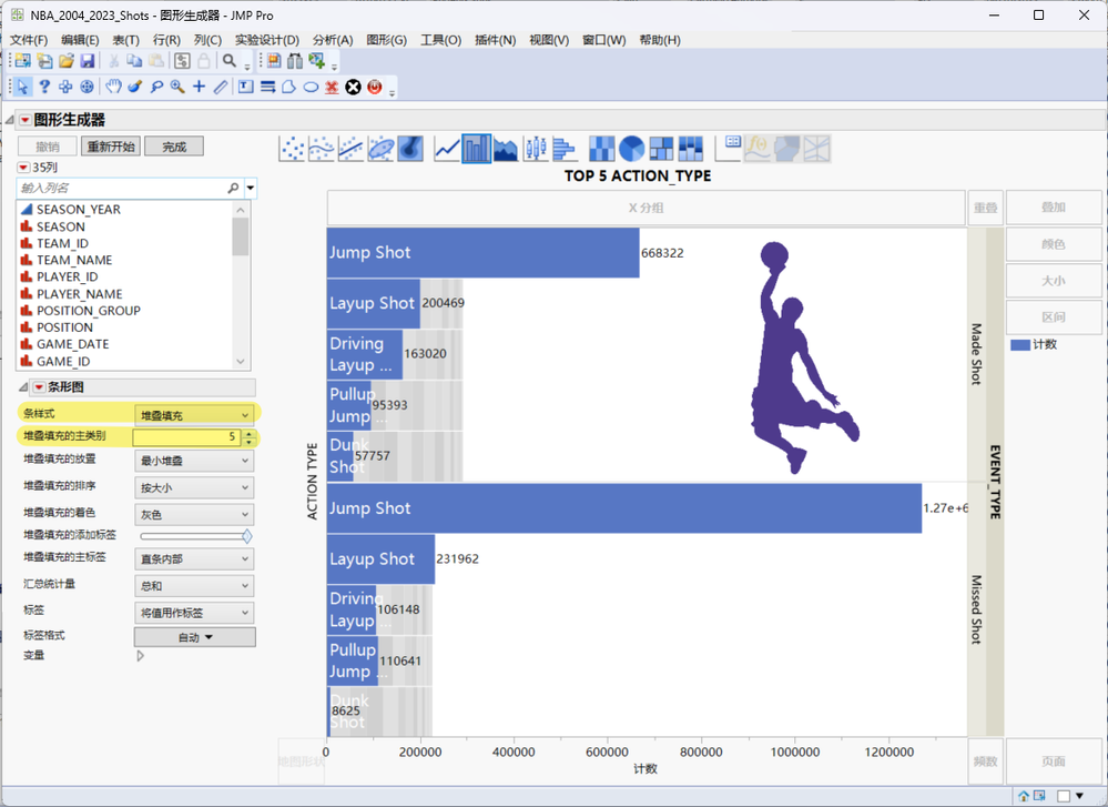 下方的條形圖,它向我們展示了最常見的5種投籃動作。在JMP的圖形生成器畫條形圖時,選擇【堆疊填充】,並設置【堆疊填充】的主類別為【5】,就可以輕鬆視覺化我們想要的資訊。從圖(四)中可以看出,跳投(Jump Shot)高居榜首,而上籃(Layup)緊隨其後,反映了籃下依然是得分的重鎮。