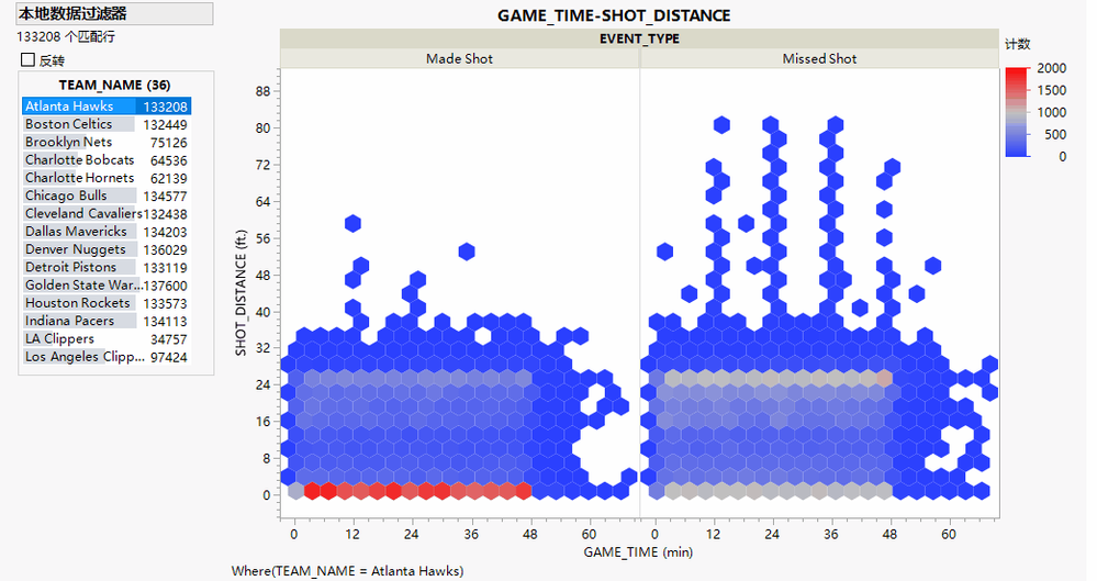 再來看這張比賽時間與投籃距離的熱圖,一眼望去,大部分投籃都集中在24英尺(feet)以內的區域。同時,我們還發現球員們似乎更願意在每小節比賽快要結束的時候拉開距離,嘗試遠距離投籃。尤其是在未投進的Missed Shots中這樣的嘗試更加顯著。是戰術調整?體能分配?還是搏一搏好運?配合TEAM NAME作為Local data filter,這張圖似乎在向我們訴說著每支球隊策略背後的故事。
