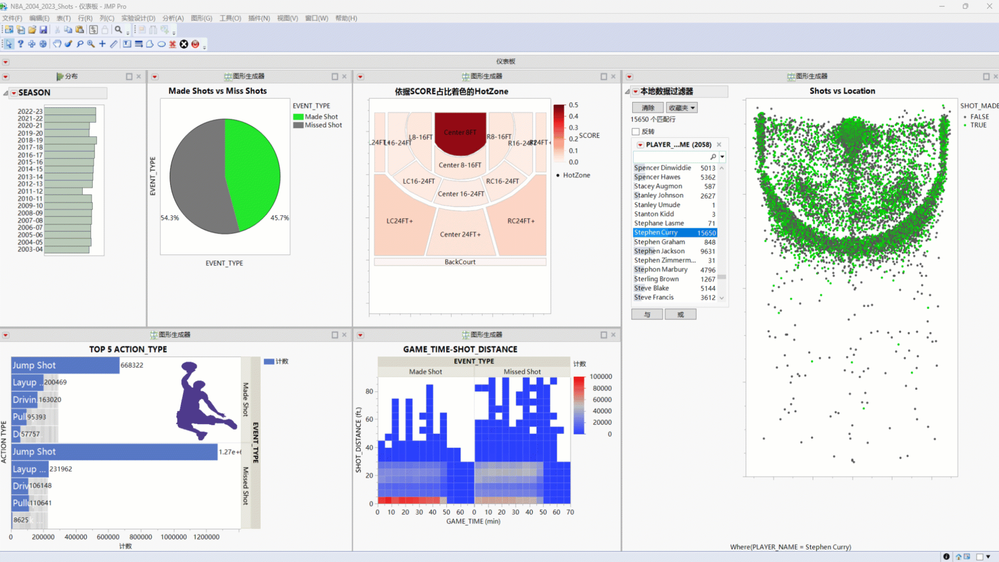 使用JMP的儀錶板,可以製作一份NBA投籃數據揭秘看板,組合所有我們感興趣的圖表,並且圖表是交互式的動態圖片,可以輕鬆透過鼠標的點選查看數據之間的交互。這張儀錶板不僅僅是冰冷的數字的集合,它是籃球場上激情與智慧的視覺化集成。