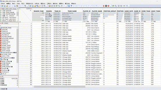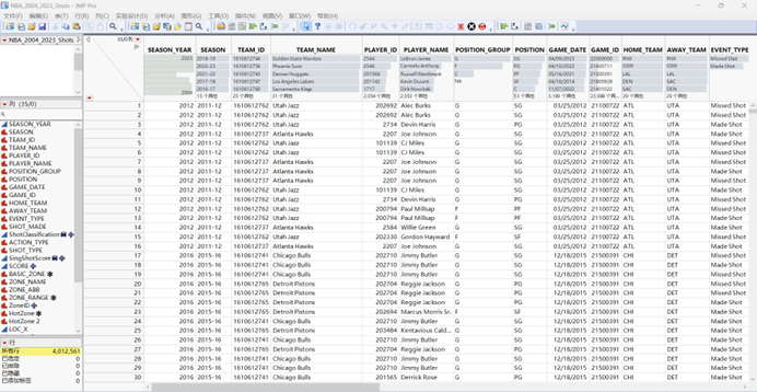 本文使用的數據來源於NBA官方公開數據集。在JMP中數據表截圖,如下圖(一),共有4012561行數據,每一行代表一次投籃的資訊。數據表共35列。我們就使用這個含有超過400萬條投籃記錄的龐大的數據表,使用JMP強大的視覺化功能來快速揭秘這些年投籃數據背後的秘密。