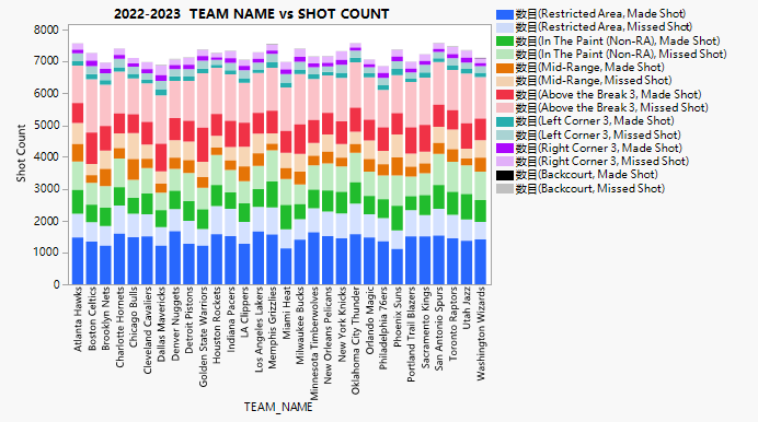 JMP的圖形生成器的條形圖可以很好地幫助我們發掘這個資訊。我們篩選出2022-2023賽季NBA30支球隊的投籃數據,我們可以看出,幾乎所有球隊在"Restricted Area"(禁區,圖(三)中深藍色條形)裡的得分效率都是最高的,雖然禁區通常是防守最嚴密的地區,但是籃下的機會也更多。