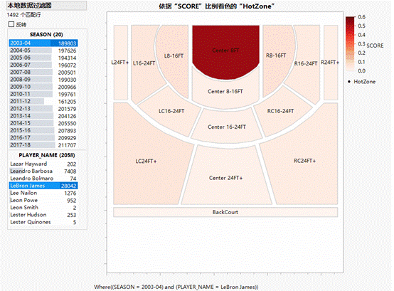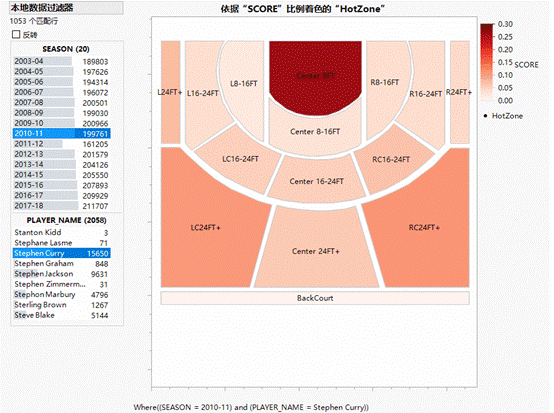 每個時代都有其標誌性的球員,他們在關鍵時刻的決定性投籃往往能改變比賽的走向。NBA球員數據統計中常用的熱區(Hot Zone)透過分析球員得分的場地區域,就可以發現他們在籃球場上的手感偏好。球員們的熱區(Hot Zone )猶如戰場上的制高點,是他們攻城略地的關鍵,展示著他們的實力和風格。使用JMP軟件的定制地圖(custom map),就可以直觀呈現投籃熱區。