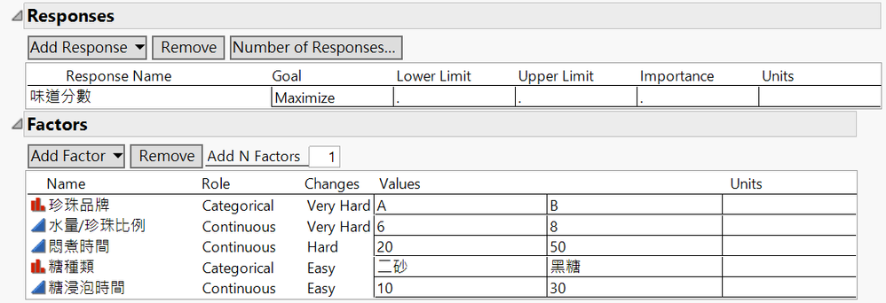 爸爸:對的,因為其中的珍珠品牌及水量/珍珠比例會是一個比較難更改的因子,所以我們這次要JMP幫我們根據因子更動的難易度去設定適合的實驗。