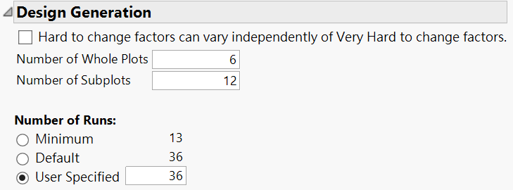 爸爸邊說邊把報告往下拉,接著說:另外,因為我們有將因子設定「非常難改變」跟「難改變」兩個層級,在Design Generation下面,我們可以選擇「非常難改變」跟「難改變」兩個之間是不是獨立的關係,也就是這兩層是巢狀結構或是交叉的結構,如果打勾Hard to change factors can vary independently of Very Hard to change factors,就代表兩層為「交叉結構」,沒打勾的話就代表是「巢狀結構」。(如圖四)