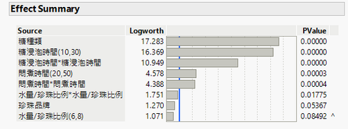 樂樂點了點頭表示了解,爸爸接著說,你看Effect Summary 的報告,可以發現糖的種類跟糖浸泡的時間是前兩名,這些因子會影響珍珠的甜味,特別是糖種類,影響特別多。另外,悶煮的時間也是一個很重要的條件(圖七)。