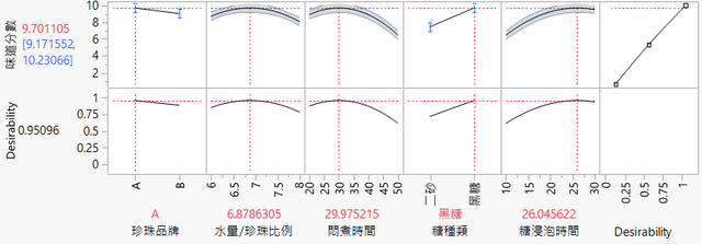 接著爸爸運用刻劃器最大化意願函數(Maximize Desirability)的功能,得到最佳的參數組合條件為A珍珠品牌,用水量/珍珠約6.9的比例去煮,煮的時間約為30分鐘,煮完以後用黑糖浸泡約26分鐘,就可以得到預期分數為9.7的好吃珍珠(圖十)。
