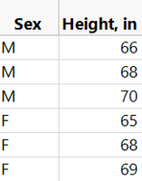 As a simple example, let's say that we want to determine whether the heights of adult males is different from the heights of adult females. We have limited resources, so we can only measure the heights of three males and three females in this test. We randomly stop three males and three females on the street and measure their heights (shown below):