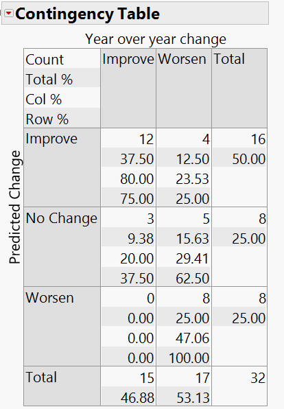 The model performed best at predicting the NFC North and the AFC East results. The model did a poor job of predicting both AFC and NFC South results. One thing that the projections from the model did an excellent job of predicting is whether a team would improve or get worse. Below are a mosaic plot and contingency table showing whether a team improved or got worse from 2016 to 2017.