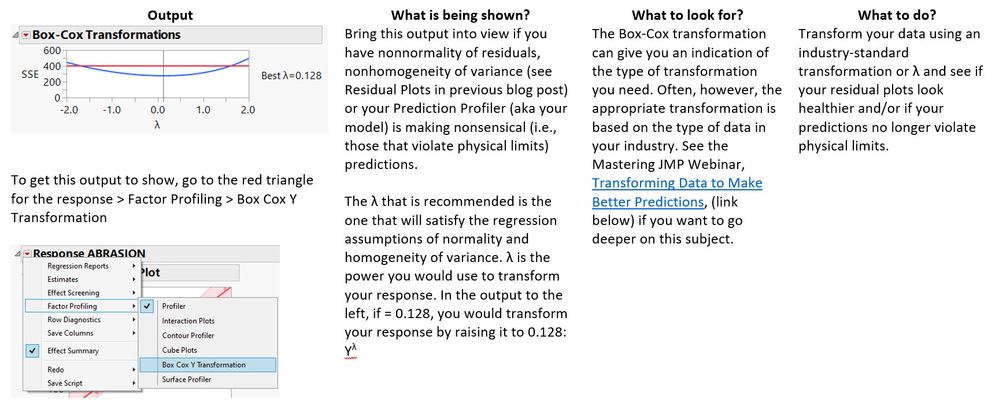 In this post, we discussed two outputs to help you assess and remedy, if necessary, model health issues: Lack of Fit and Box-Cox transformation. We also discussed two outputs to help you further understand the process and, ultimately, decide how to improve the process and communicate your actions to stakeholders: Variable Importance and Effect tests.