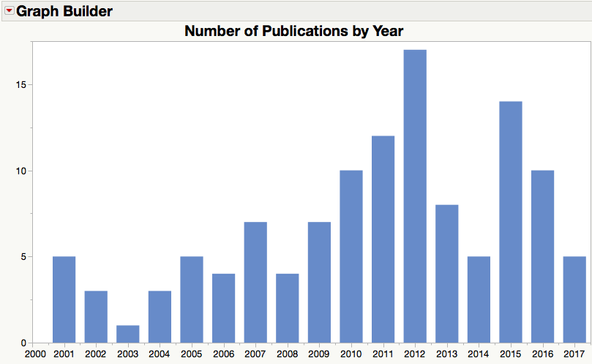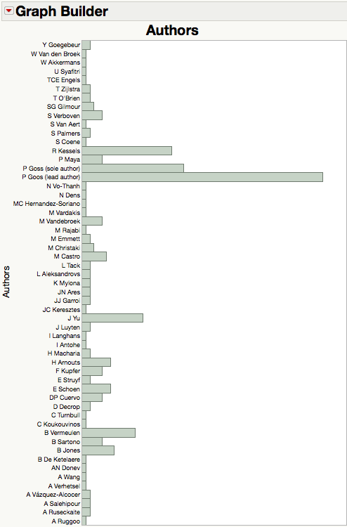 Peter Goos is a professor of statistics at University of Leuven and University of Antwerp, and a prolific author on split-plot designs and optimal design of experiments. He probably holds a record for most published at such a young age! This graph shows how busy he’s been, with publications shooting up right after he graduated. He’s been busy ever since.