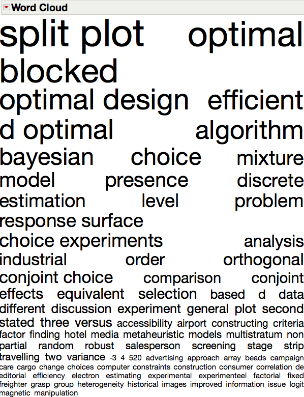 And it’s no surprise to see the terms split-plot, optimal and blocked so prominently featured in this word cloud of his publication titles.