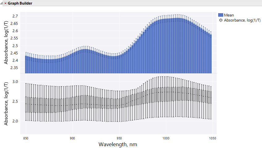 Other summary measures that will quantify the quality of spectra are accessible in Graph Builder. To create these, remove the overlay variable so that the mean spectra is shown. Then, selecting the bar plot and box plot options will generate the plots in Figure 3. Variation that is constant across wavelengths often indicates noise – and a need for further pre-processing – whereas large variation that is specific to certain wavelengths may indicate real chemical effects.