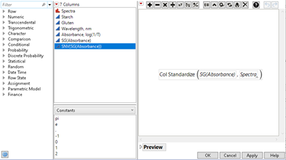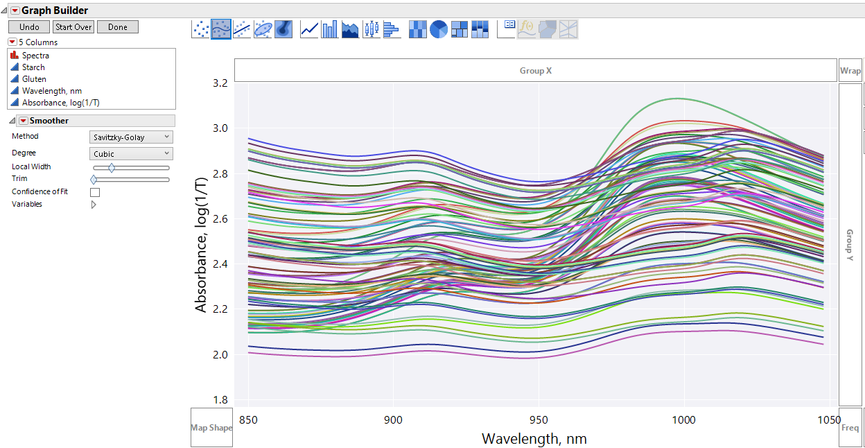 Also, new in JMP 16 in Graph Builder, Savitzky-Golay (SG) smoothing can be applied as an initial pre-processing step (Figure 2). Once you select your tuning parameters, you can output the smoothed data. Go to the smoother red triangle and select Save Formula. Note that this will require your wavelength to be a continuous variable (you can modify the variable type if you need using the Column Properties).