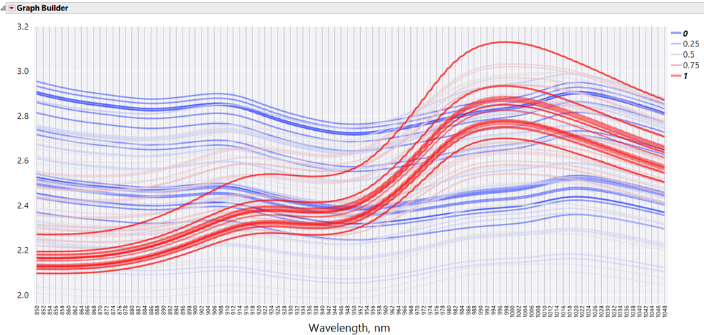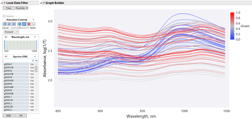 Figure 1 shows a line plot of the spectra in Graph Builder. With your data in the stacked format, drag the X and Y variables to their respective axis, and use the spectra ID as the overlay variable. Alternatively, you can use the Launch Graph Builder command in Spectra Tools. For the color variable, we use the response variable of interest, which is gluten content.