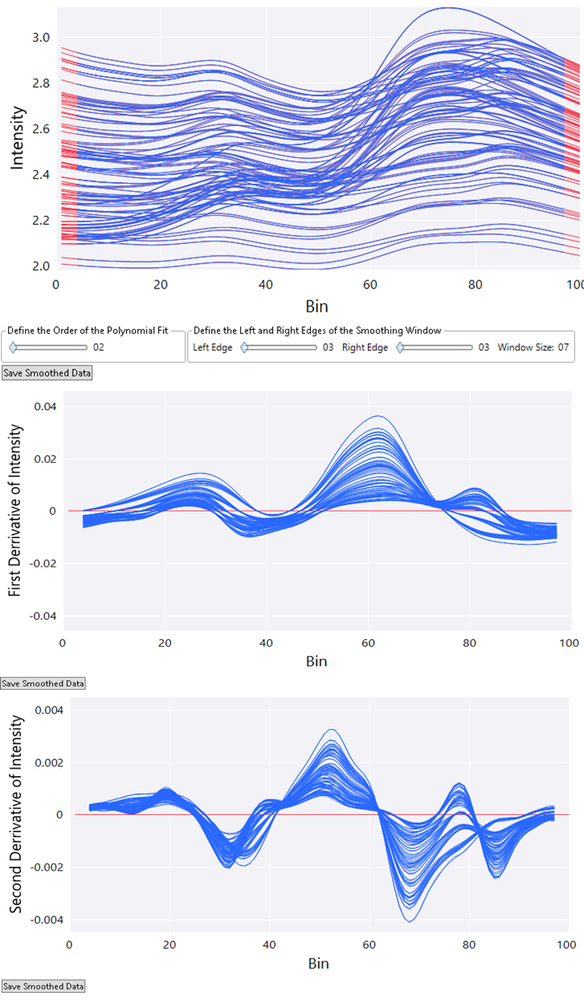 The SG smoother user interface is where the polynomial order of fit, 2 – 8) is defined, and the length of the right and left edges of the smoothing window are also defined. Changing any of these values automatically updates the graphs, since the derivatives are performed on the SG smoothed spectra. Since derivative filters amplify noise, a certain degree of smoothing is often required. Figure 5 shows the output graphs.