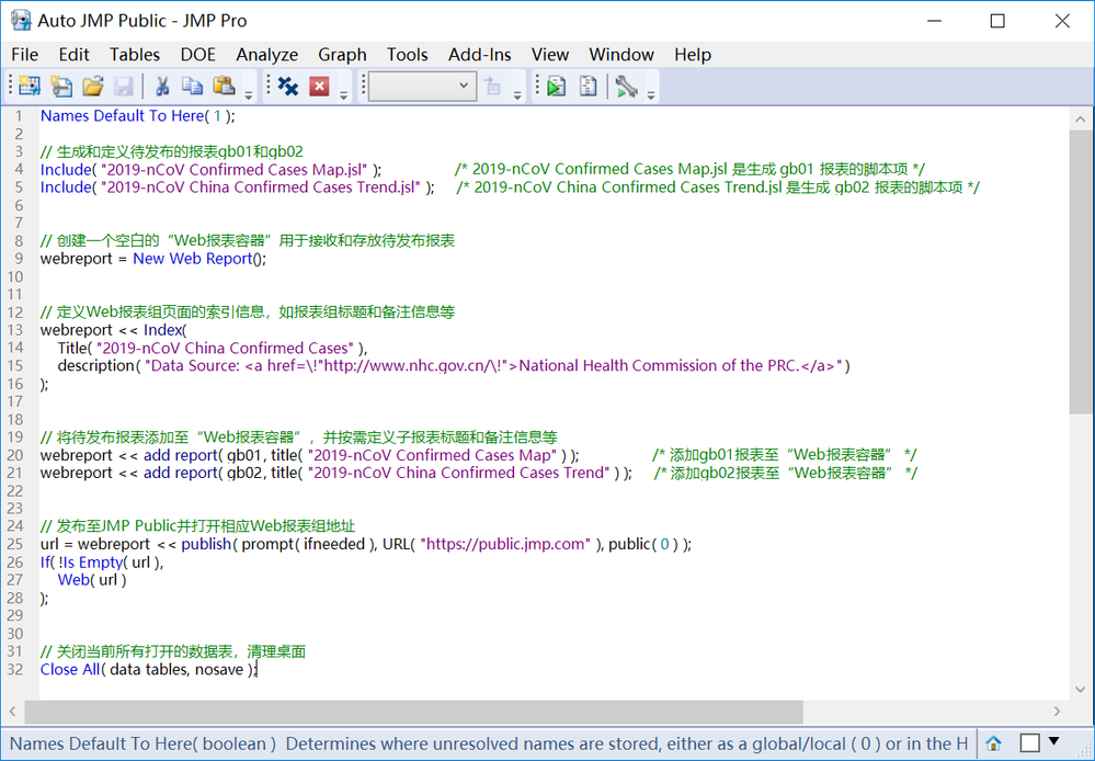 我们直接给出发布该JMP Public报表的JSL参考模板框架如图-2所示,各语句职能参见绿色备注信息。