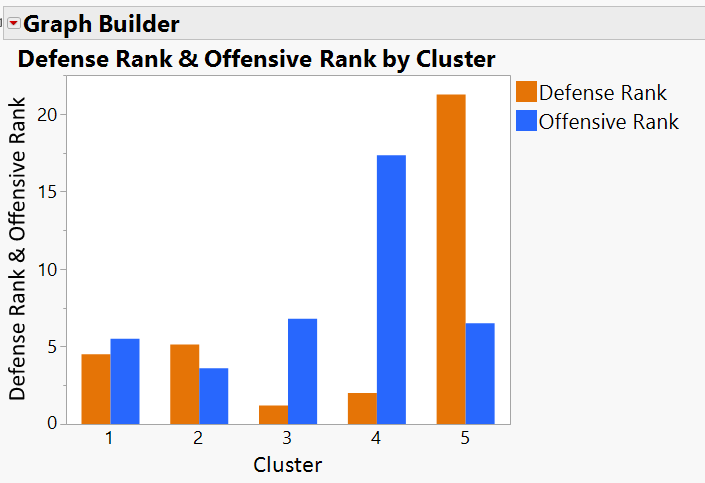 Most of the past champions along with both of this year’s participants are in Clusters 1 and 2. Let’s look at the average offensive and defensive ranks based on points scored and allowed each game for each cluster.