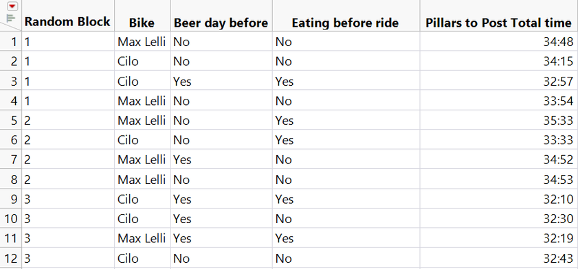 I set this up as a functional DOE as I want to measure my heart rate and speed throughout the ride. My other response measured was climbing time, which I called pillars to post time (there are pillars at the start of the climb and a post at the end). I also recorded the weather at the start of the ride, my weight before the ride, days since my last ride, and if I had gone for a run between rides. I attempted to space the rides either two or three days apart, and have the rides start around the same time in the morning. I set up the DOE in JMP with a random block factor to group these rides into weeks in case my performance improves during the DOE. The DOE with results is shown in the data table below.