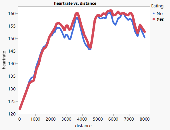 Eating before the ride did not impact my ride time up the mountain significantly, but it did have an impact on my two functional responses: heart rate and speed. Below is a graph of my average heart rate by distance into the climb based on whether I eat before the ride or not. With eating, my heart rate tends to be higher and stay higher longer.
