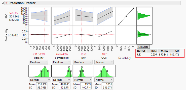 Let’s apply this second technique to our example data set. I’ve created a traditional model where I can estimate the expected response (Ex: REC=847.805) for a set of conditions. Although I can calculate the predicted response and confidence intervals of those estimates, what I cannot calculate is a result that incorporates the real-world variation that I would typically observe among my factors. By using the simulator option in JMP, I can now model factors as random distributions and produce more precise estimates in my expected response values. In my example, Monte Carlo Simulation reveals that approximately 25% of my response values are outside my lower limit of 750. With this more accurately quantified level of risk, I can make a more informed business decision now having simulated multiple scenarios and weighed their respective outcomes accordingly.