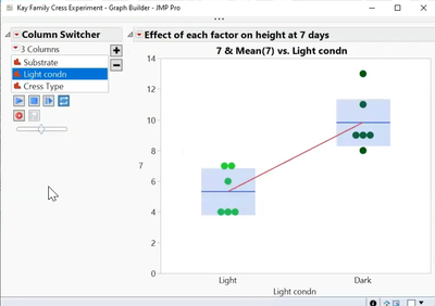 After running the experiment for a week, Phil and his daughters were able to put their results into JMP software and do some simple analyses with the tools the software provides. They were able to conclude that the plants grown in the darker conditions were taller after seven days!