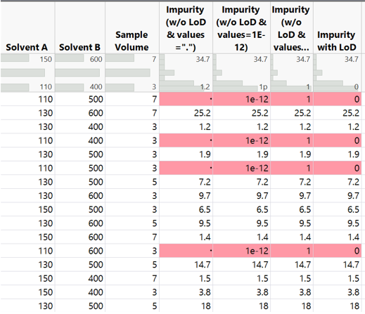 Let's consider an example: We are planning a set of experiments to determine the maximum amount of a solid impurity that can be extracted and measured with a laboratory method utilizing three inputs. The measurement method includes a lower detection limit of 1 unit. We've tried different techniques for dealing with LOD in the past, including using missing values, creating a value that is very small but not zero to allow for a logarithm to be used, imposing the limit for the observations affected by the LOD, and using the LOD control included in JMP Pro 16.