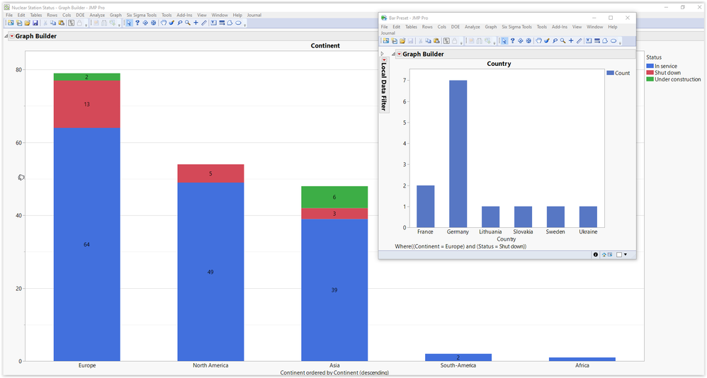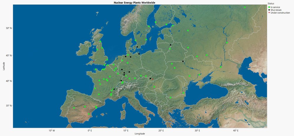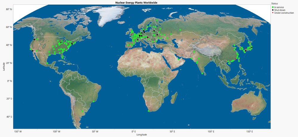 I used the Internet Open function in JMP to download the three data sets and concatenated them. Worldwide, Europe has the greatest number of nuclear energy plants, with 64 plants in service, two under construction and 13 shut down. By hovering over on the bar chart, specifically over the 13 plants shut down in Europe, I see that seven nuclear power stations have been shut down in Germany. In fact, Chancellor Angela Merkel’s coalition announced on May 2011 that Germany’s 17 nuclear plants will shut down by 2022, in a policy reversal following the disaster at Japan’s Fukushima Daiichi nuclear plant.