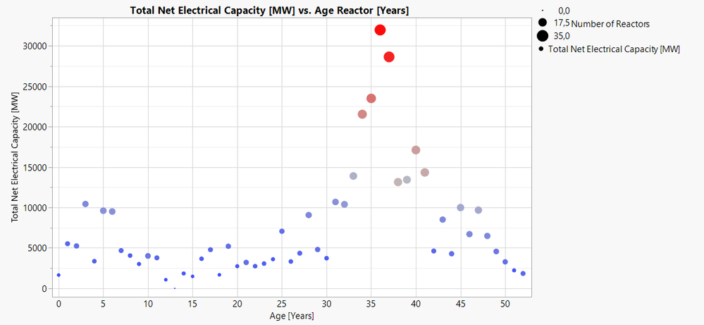 How old are the operational nuclear power stations? I found a data set on the IAEA PRIS website, representing the number of operational reactors by age and the total net electrical capacity (MW). In the chart below, the size of the dots reflects the number of reactors, and the color reflects the total net electrical capacity. The chart clearly indicates that most operational nuclear power stations are 30-40 years old.
