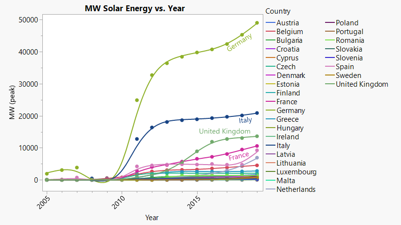 After deciding to shut down nuclear reactors, Germany aimed to close the gap in production with energy transition (renewable energy), also called “Energiewende.” Germany invested greatly in solar and wind energy. Using data from Wikipedia that examined solar energy trends over the last 15 years in the EU, I could clearly see that Germany has been the leader in the EU since 2011.