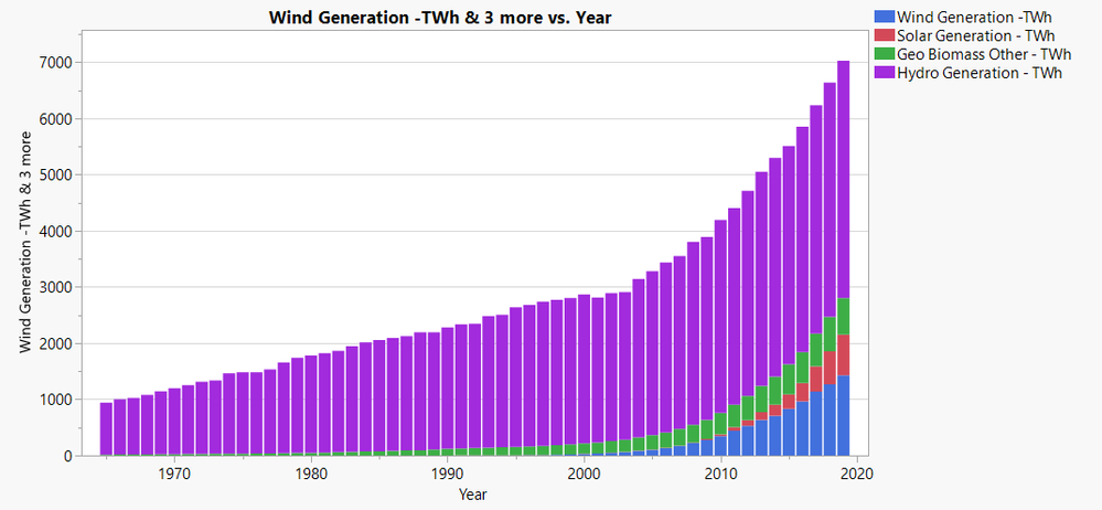 This trend not only exists in Europe but also worldwide. Data from ourworldindata.org nicely shows this trend extending to every continent. I have to confess that I did not show hydro or biomass and geothermal energy generation. In fact, in some countries (such as Iceland), those renewable energies are the most predominant. In this snapshot of worldwide renewable energy generation since 1965, we actually see that hydro energy generation is the worldwide leader in renewable energy generation, followed by wind power.